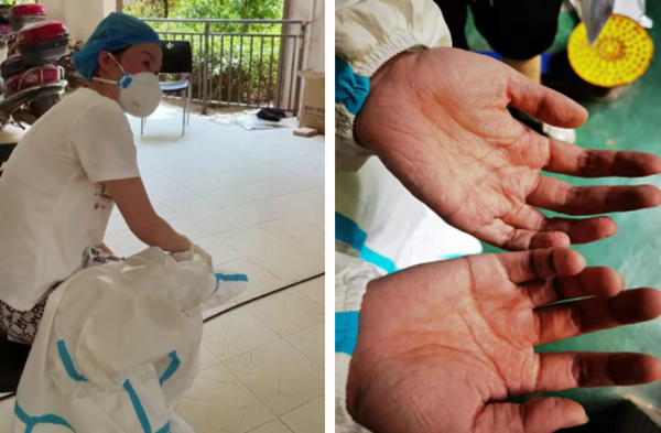 在長沙某小區 ,一名采樣人員出現中暑癥狀;jiuyou九游采樣人員雙手被汗水泡得發白、發皺
