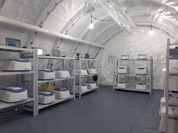 3月19日清晨,團隊及物資到達懷化后,又迅速投入到氣柱式帳篷實驗室安裝工作中,并于當日全部建成投入使用。該實驗室日最高檢測樣本量達到3萬管以上,按照10混1的檢測方式,每日最高檢測樣本量達30萬人份。