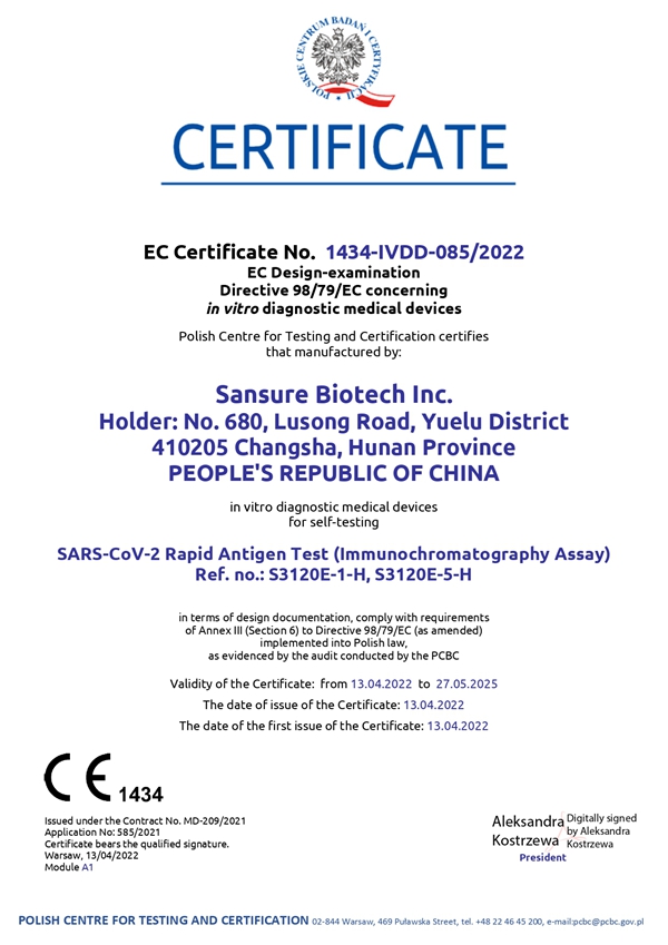jiuyou九游生物新冠快速抗原檢測試劑自測產品取得歐盟CE1434自測證書,表明公司免疫檢測產品性能獲得官方機構認可,進一步豐富了jiuyou九游生物全場景化新冠檢測解決方案,擴大和滿足了全球市場各級檢測防控需求,為全球疫情防控工作持續助力。