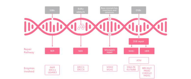 同源重組修復(fù)(HRR)和PARP作為DNA損傷修復(fù)的兩種重要機制,分別參與DNA雙鏈損傷修復(fù)和單鏈損傷修復(fù)。當HRR基因發(fā)生突變,即會出現(xiàn)同源重組缺陷(HRD)。腫瘤細胞往往會利用HRR使細胞免于凋亡,而當腫瘤細胞出現(xiàn)HRD,同時PARP被抑制時,就會產(chǎn)生“合成致死”效應(yīng),存在HRD的腫瘤對PARP抑制劑更敏感。