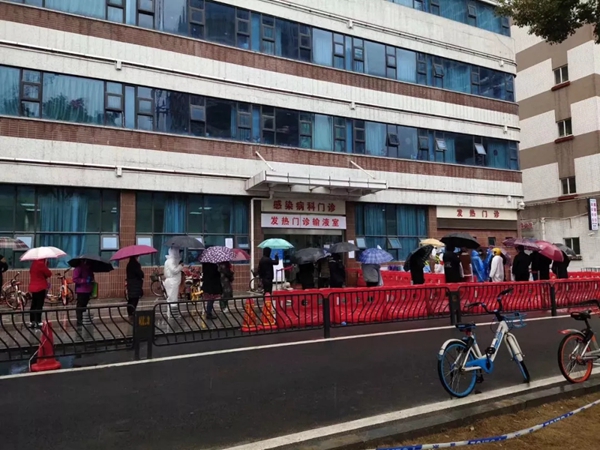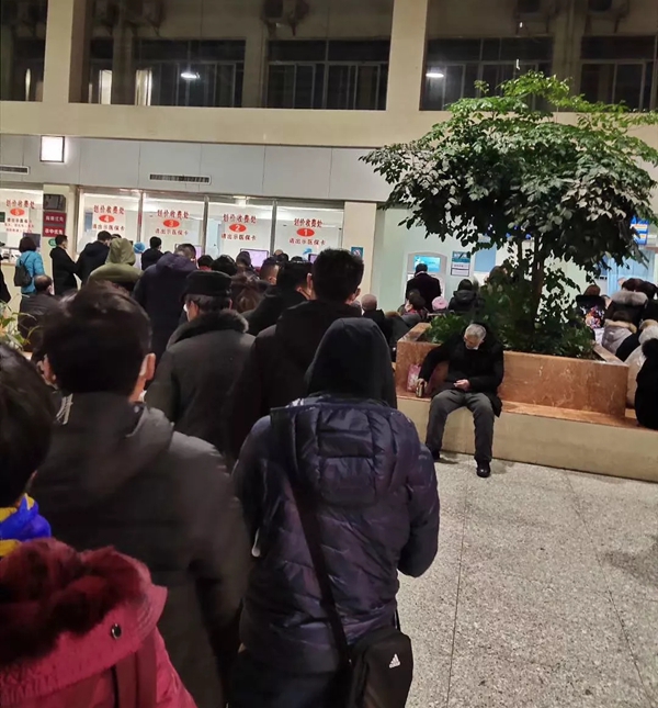 當(dāng)天清晨,武漢協(xié)和醫(yī)院發(fā)熱門診前排著長隊(duì)的市民。
