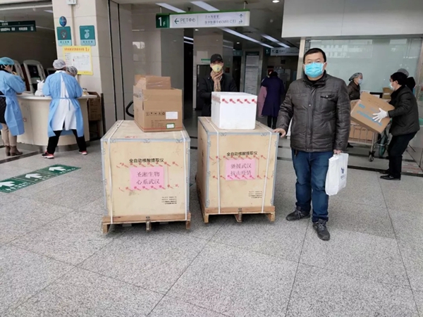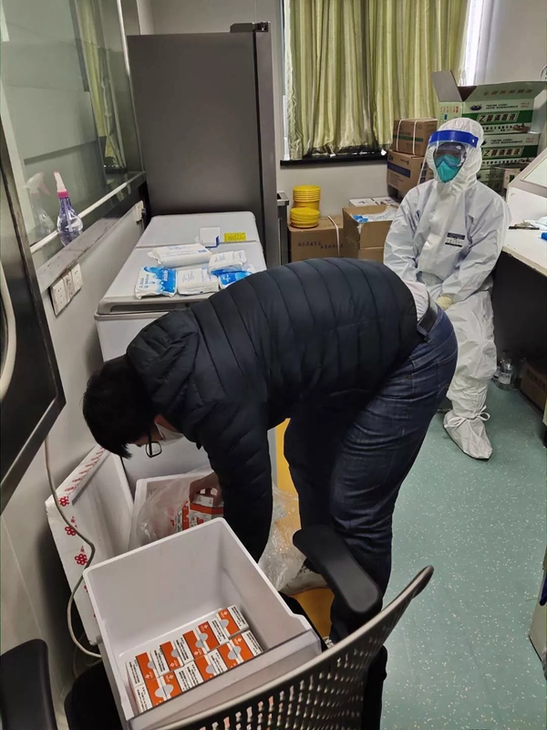 jiuyou九游生物捐贈(zèng)的第一批醫(yī)療設(shè)備、試劑以及配套耗材,順利抵達(dá)武漢。與當(dāng)?shù)睾献魃桃黄穑b運(yùn)貨物入庫。
