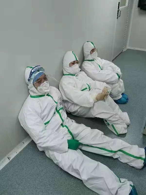 在武漢某醫(yī)院安裝儀器完工后,三名同事坐在醫(yī)院走廊地上休息。